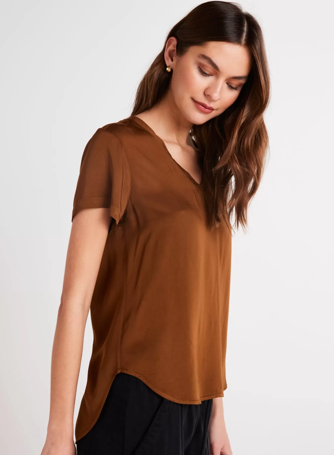 This classic V-Neck tee is a staple for your wardrobe. It is designed with comfort in mind and it features a hi-low hem style. Style it tucked in your jeans or as is. 100% Satin Ecovero
